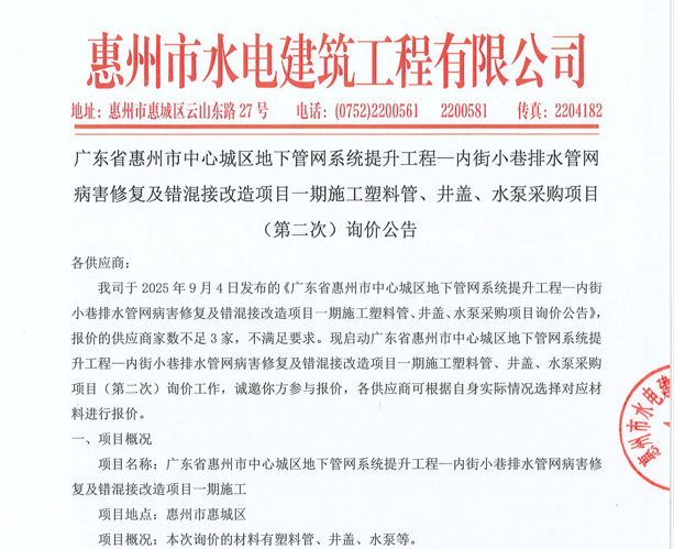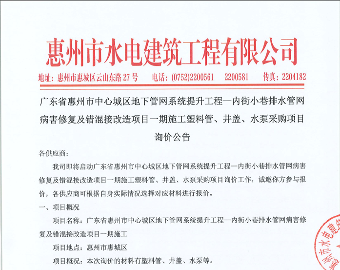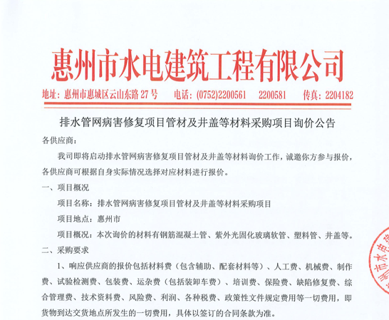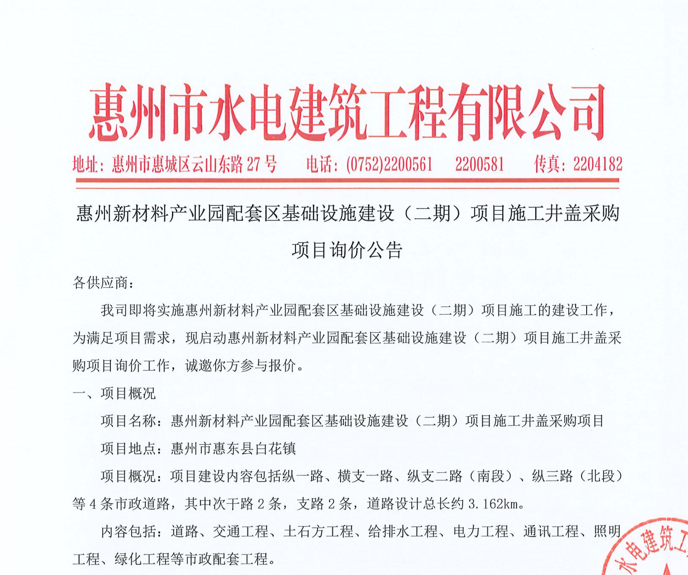惠州新材料產(chǎn)業(yè)園配套區(qū)基礎(chǔ)設(shè)施建設(shè)(二期)項目施工井蓋采購項目詢價公告……